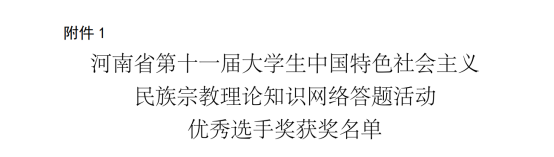 11月28日,河南省教育厅公布了河南省第十一届大学生中国特色社会主义民族宗教理论知识网络答题活动结果,我校测绘工程学院学生陆旭、贺进喜、刘政阳在活动中表现突出,荣获河南省教育厅统战处颁发的“优秀参与奖”荣誉证书。