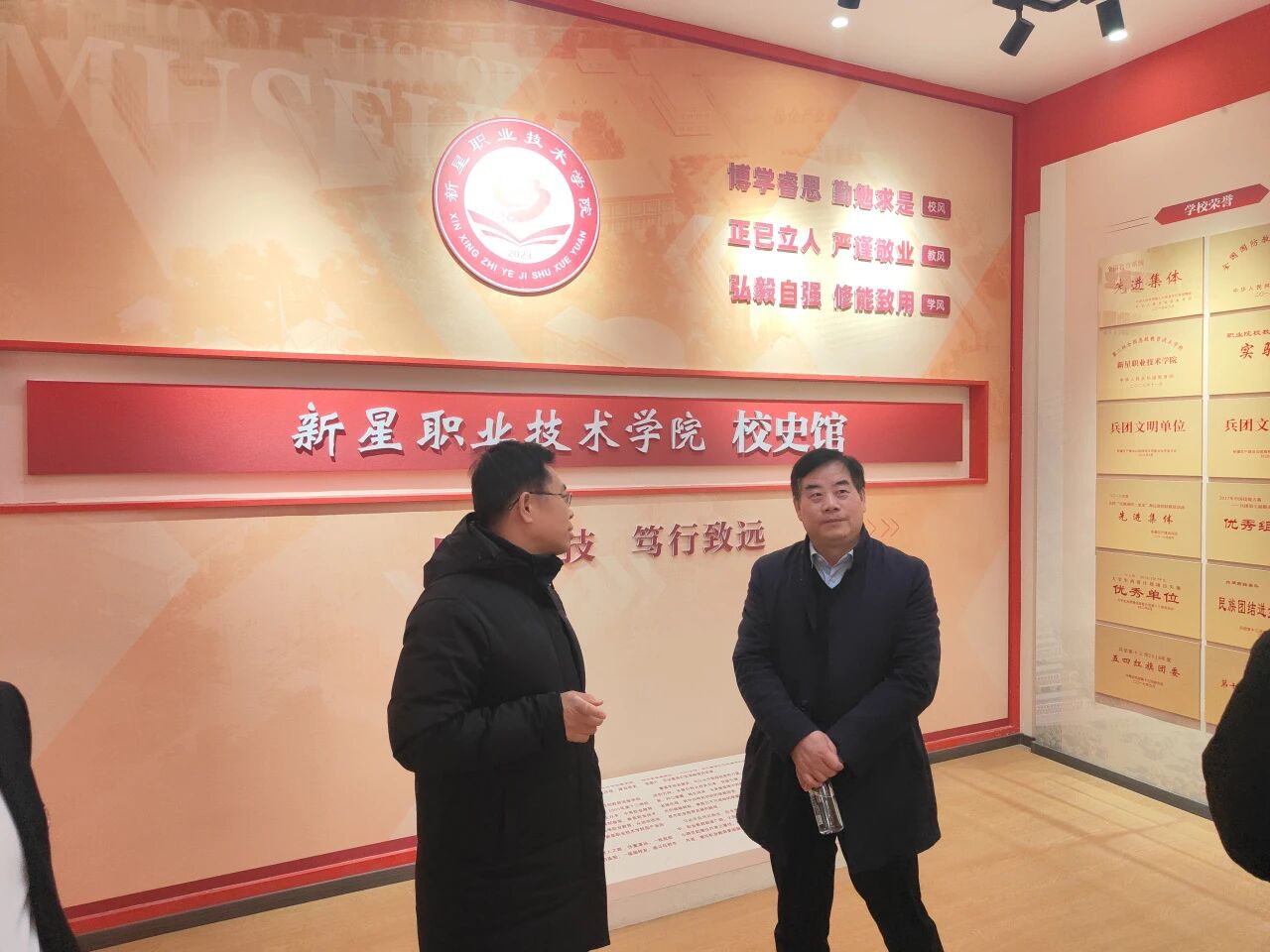 在新疆生产建设兵团第十三师新星市教育局党组成员、副局长李瑞林、教育服务保障中心副主任苏金蓉等相关领导的陪同下,焦洪涛一行首先来到新星职业技术学院。期间,听取了副校长陶涛关于学校专业布局、办学定位、人才培养等方面的详细介绍,座谈会上,双方聚焦产教深度融合、专业共建共享、师资双向互派、学生实习就业帮扶等核心议题展开深入交流,就搭建常态化协作平台、整合优质教育资源、推动合作落地见效等达成初步共识。会后焦洪涛一行还参观了校史馆、实训基地等场所。