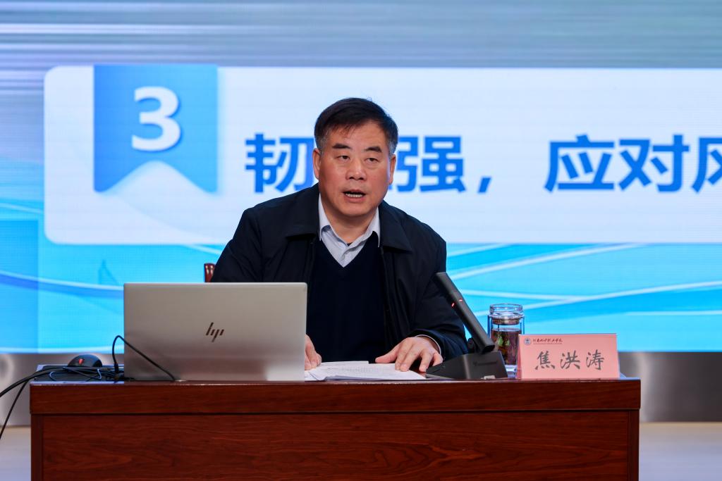 12月3日,党委书记焦洪涛在勤奋楼学术报告厅以“正确认识中国经济热点问题”为题讲授专题思政课,本次授课由党委副书记杨健主持,师生代表聆听授课。