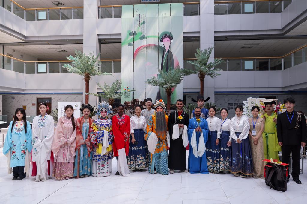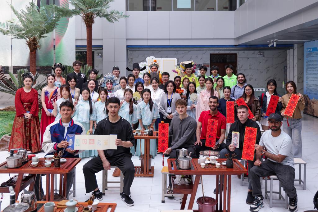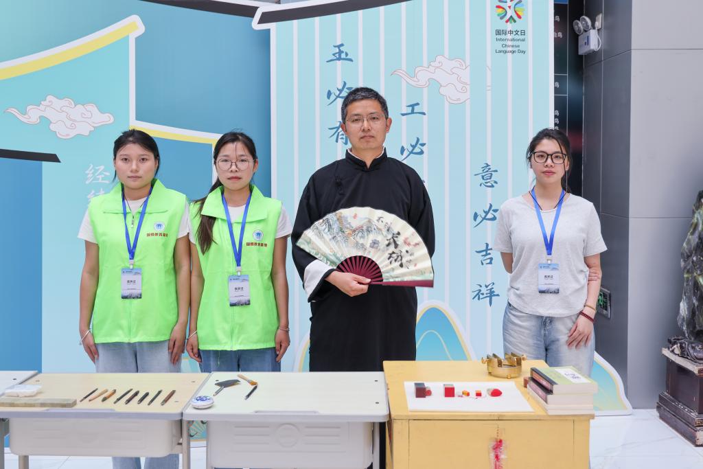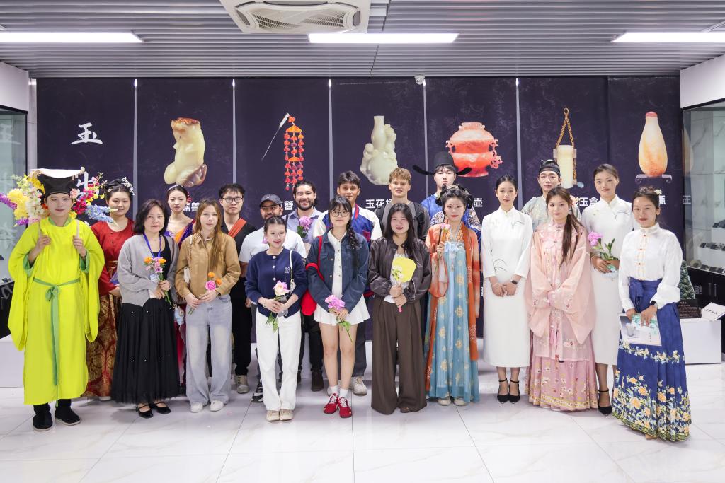 活动现场的五大主题文化体验区,变身为中外青年深度互动的“文化集市”:在“君子佩玉”区,留学生们穿上传统汉服,在老师的指导下体验古代揖礼,衣袂飘飘间感受中华礼仪之邦的风范;在“玉笔生花”区墨香四溢,留学生们手执毛笔,在一撇一捺间体验汉字书法的韵律。来自埃及的留学生兴奋地展示着自己刚刚写下的“玉”字,她说:“中国汉字就像一幅画,这个‘玉’字让我感受到了温润和谐的美。”“金声玉振”戏曲体验区气氛热烈,大家跟随戏曲表演者学唱经典唱腔,亲身体验水袖的灵动与脸谱的描绘;“锦衣玉食”区则让留学生在舌尖上品味中国,来自津巴布韦的留学生一边品茶一边感叹:“我以前只知道中国茶好喝,今天自己体验了泡茶的过程,才懂得这小小的茶杯里藏着大大的学问,这就是中国式的浪漫吧!”“玉汝于成”玉雕篆刻手工技艺区最受追捧,留学生们拿起刻刀,在三位工匠大师的手把手指导下体验玉石雕刻、篆刻及手工串珠。来自洪都拉斯的留学生看着自己亲手打磨出的玉石,满脸自豪:“玉在中国人心中竟然有这么高贵的地位,‘玉汝于成’这个成语告诉我,美好的事物都需要经历困难和磨砺,这对我学习中文也是很大的鼓励!”
