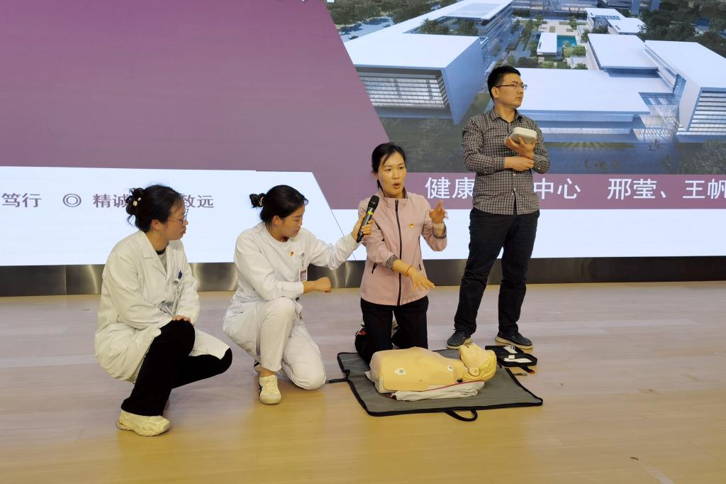 本次活动由校医务室牵头,邀请阜外华中心血管病医院医护人员做现场指导。讲座现场,校医务室老师与医院医护人员共同讲解演示了心肺复苏(CPR)、AED使用等操作,并“手把手”指导师生们在模拟人上反复练习,纠正按压位置、力度和频率。医务室负责人还向师生详细介绍了校园内AED设备的分布点位(教学楼、宿舍楼、体育场等)及取用方法。